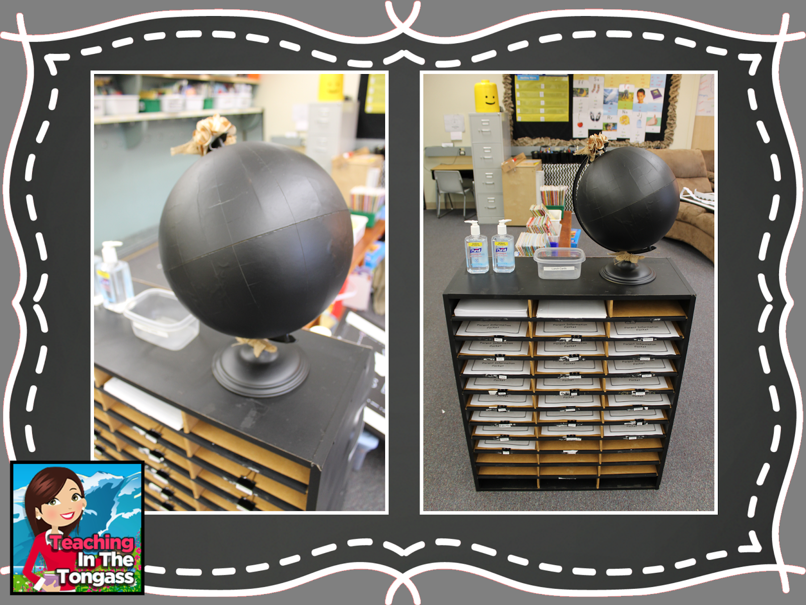 The chair was a gift from my host teacher. It was red…until this weekend when I attacked it with flat black spray paint and added a burlap cover with my Mr.Tongass’ staple gun. The horseshoe table doubles as my desk and small group area. If you haven’t already thought of getting rid of your desk, I highly recommend it! I got rid of mine a couple of years ago and love it!